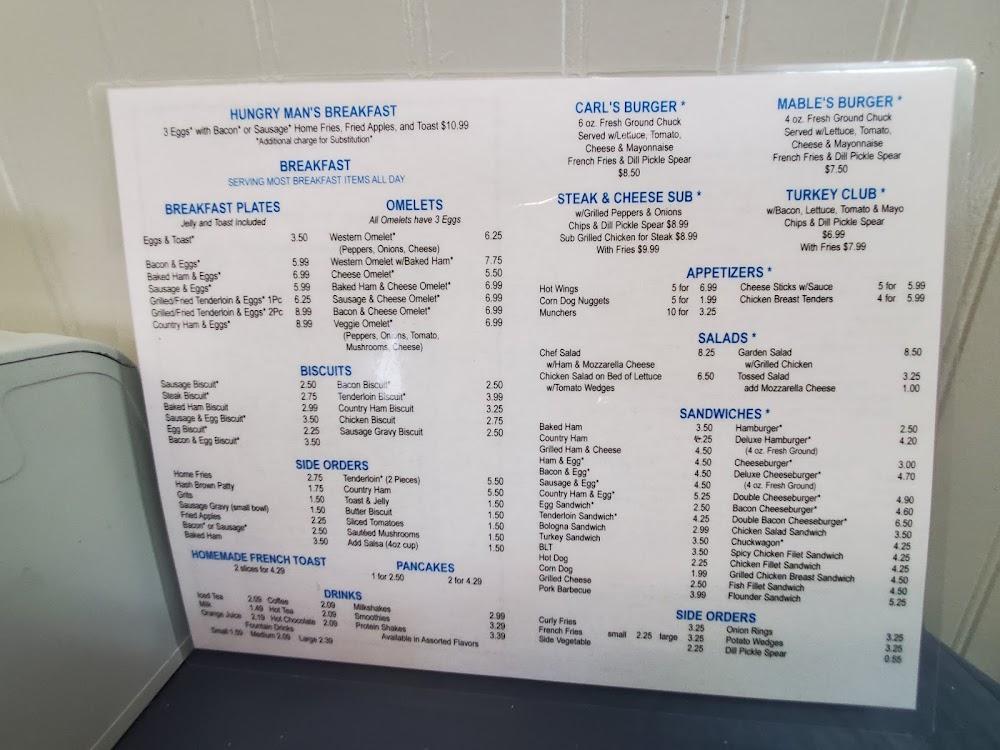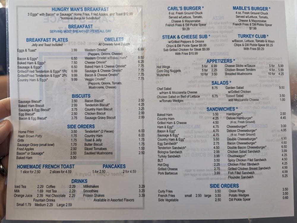 The menu at Carl's Place features classic American fare, focusing on breakfast and lunch items. Patrons can enjoy diverse options, from omelets and biscuits to burgers and hearty dinners. The Western Omelet, loaded with ingredients, stands out as a signature choice. Appetizers like hot wings and chicken tenders offer tasty starts. Desserts, including pecan pie and milkshakes, provide a sweet finish to your meal. Vegetarians will appreciate several salad options to cater to different preferences. There’s something for everyone here, making it an excellent choice for family dining or solo adventures. The prices remain affordable, generally in the $10-$20 range, ensuring a satisfying meal that won't break the bank.
